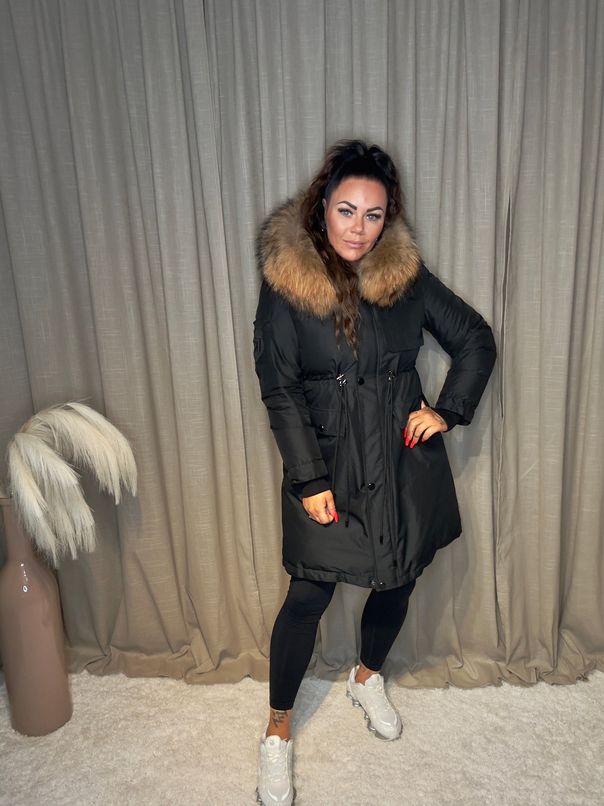 Akureyri Parka með þvottabirni. Þessi fallega parka er fullkomin blanda af glæsileika og hlýleika! Þvottabjörninn er yfirburða glæsilegur og lyftir flíkinni upp á næsta stig. Akureyri parka er með stillanlegri mittisreim sem mótar sniðið að líkamanum og gerir fallega lögun.